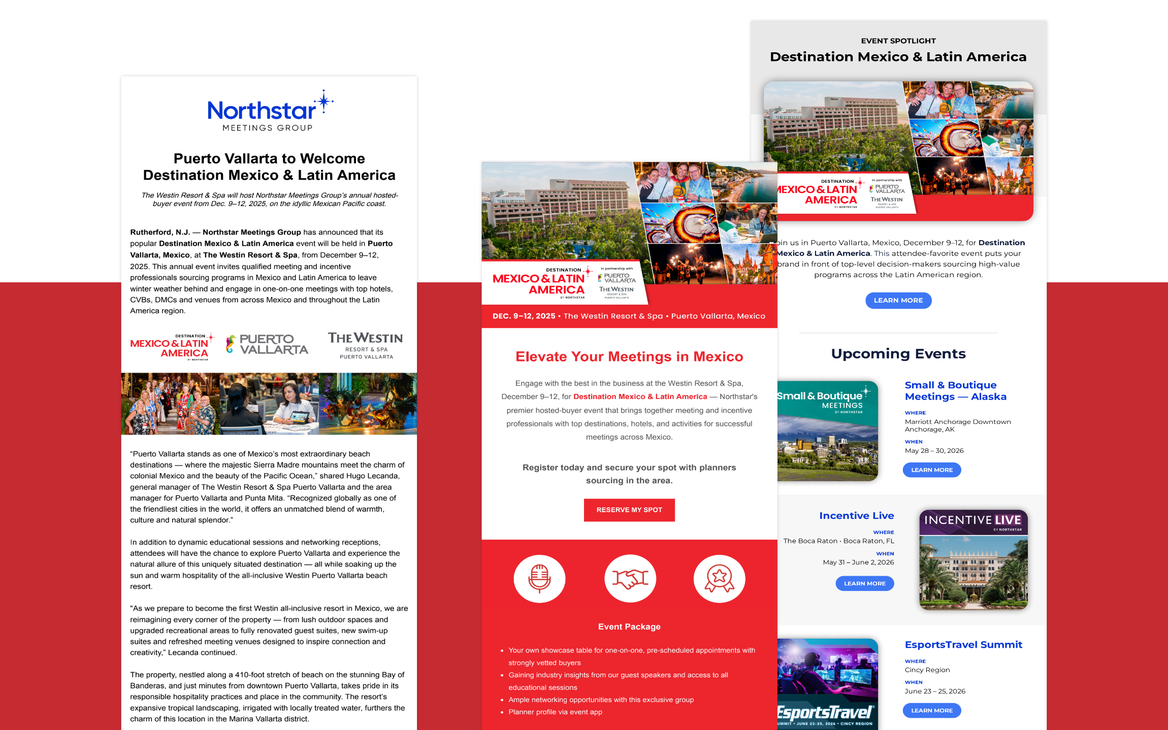 I’ve led the creative direction, design, and marketing for Northstar’s nine destination-specific events since joining the team in 2023. This entails everything from the graphics and newsletters which promote events, to the app layout and on-site signage which actively shape attendee experiences. In 2025, Destination Mexico & Latin America was hosted in stunning Puerto Vallarta, so I set out to spotlight the scenic and diverse features of this destination with a vibrant marketing campaign.